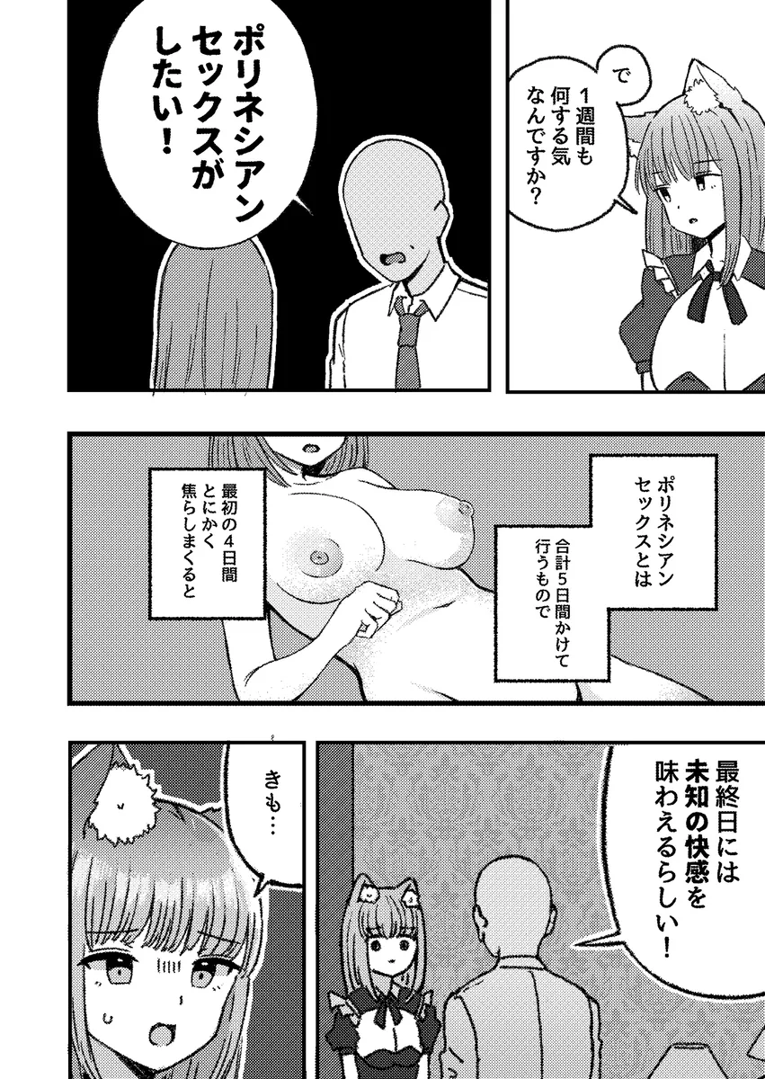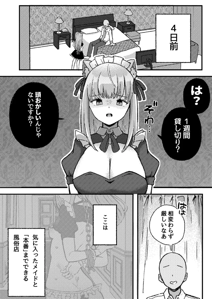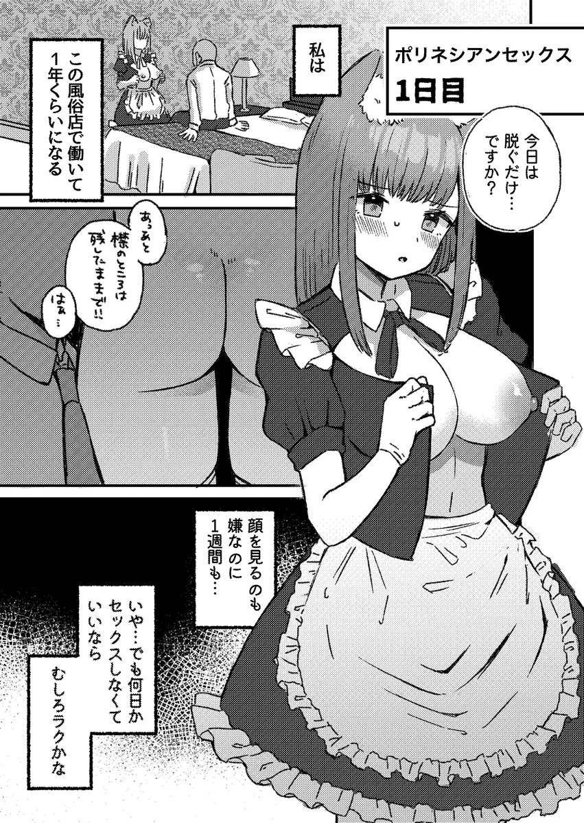 ここは気に入ったメイドと本番までできる風俗店。金持ちの客がメイドを一週間貸し切りに。そのメイドはその客の事が好きではない。むしろ嫌いな部類に入る。そんな男と一週間も同じ空間で過ごさなければいけないのだ。男の要求はポリネシアンセックス。これは七日間かけてゆっくりじっくりとセックスをするというものだ。セックスも一日しかしなくていいのなら、簡単だとメイドは高を括るも…。まずは一日目、脱衣のみ。二日目は軽いキスと全身のお触り。三日目はディープキス解禁と徐々にセックスへと近づいていく。そして六日目が終わるころには…。