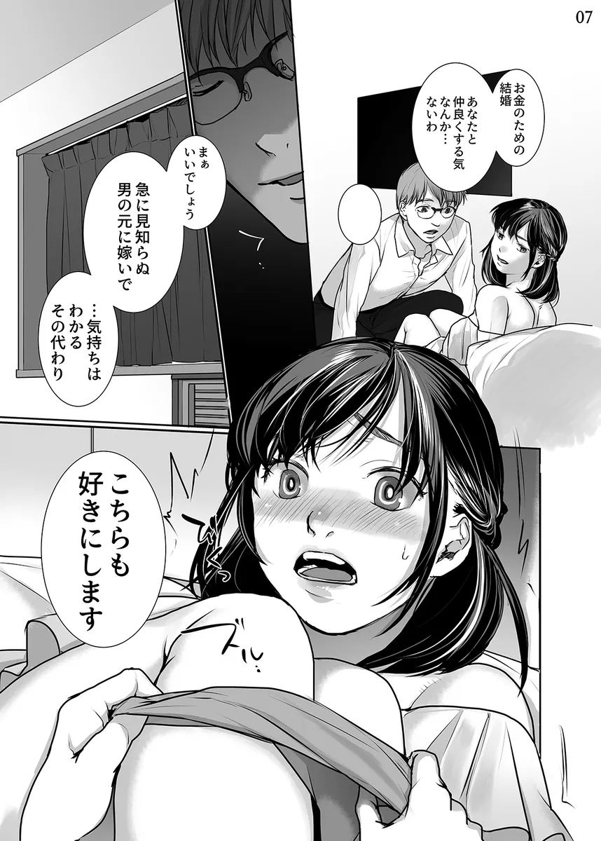 事業が失敗して多額の借金を負うことになってしまった親の元へ一人の男がやってくる。この男が言うには借金返済を手伝う代わりに土地の権利と娘をくれとのことだった。娘の親はその指示に従い、その男に娘を差し出すことになる。こうして富豪の家に嫁ぐことになった娘。初夜。男を睨みつけるもゆっくりと愛撫されていく。山芋の成分を敏感な所に塗りたくられて、さらに感じてしまう。おまんこを今すぐ触りたい…。その欲求に耐えながら男に手マンされて軽くイってしまう。「おちんちん欲しいですか?入れたらもっと気持ちいいですよ?」
