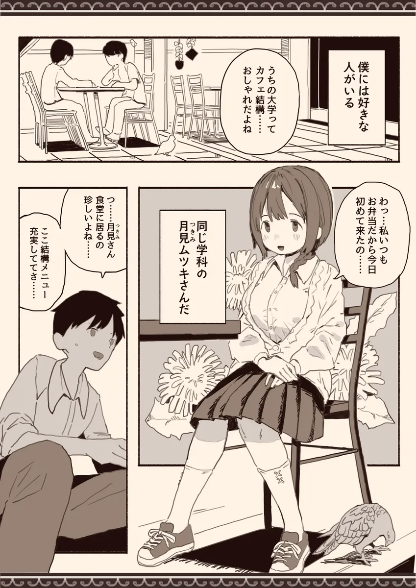このひと時がずっと続けばいいのに…楽しい時間は過ぎるのが早い…。同じ学科の大学生「月見ムツキ」の事が好きなシキ。一緒に学食を食べてシキは新しいバイト先へ向かう。するとなんとムツキと同じ顔をした女の子がそこで働いていた。聞くところによると彼女はムツキの双子の妹らしい。名前は月見キサ。顔も体も全く一緒、しかし酒の飲みっぷりや言動だけは違っていた。酔いつぶれたキサを送り届けようとするも、キサにラブホへ行こうと誘惑される。大好きなムツキと同じ体、同じ顔。シキは罪悪感にかられながらもキサのマンコにチンポをぶち込んで…。