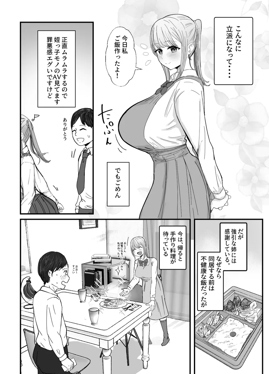 姉から姪っ子を押し付けられる。女優になりたくて上京するそうで、住むところが無いからしばらく居候させろとのことだ。終電近くまで仕事を頑張って帰宅すると待っていたのは爆乳姪っ子と暖かい料理。これもこれで悪くない。ある日、その姪っ子に姪っ子もののAVで抜いていることがバレてしまう。こうなることは時間の問題だった。爆乳を毎日見せつけられて我慢しろという方が無理なのだ。完全に終わったと思った矢先、なんと姪っ子の方からエッチに誘われる。姪っ子もずっとこうしたかったらしく…。