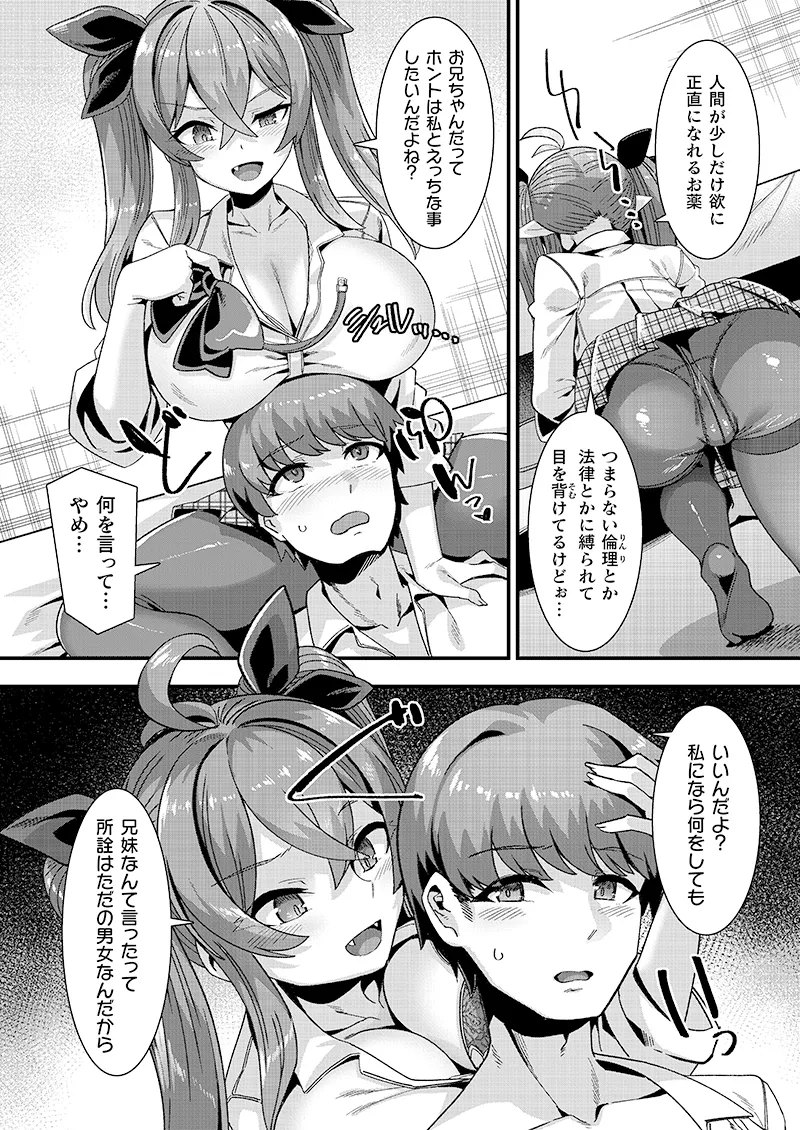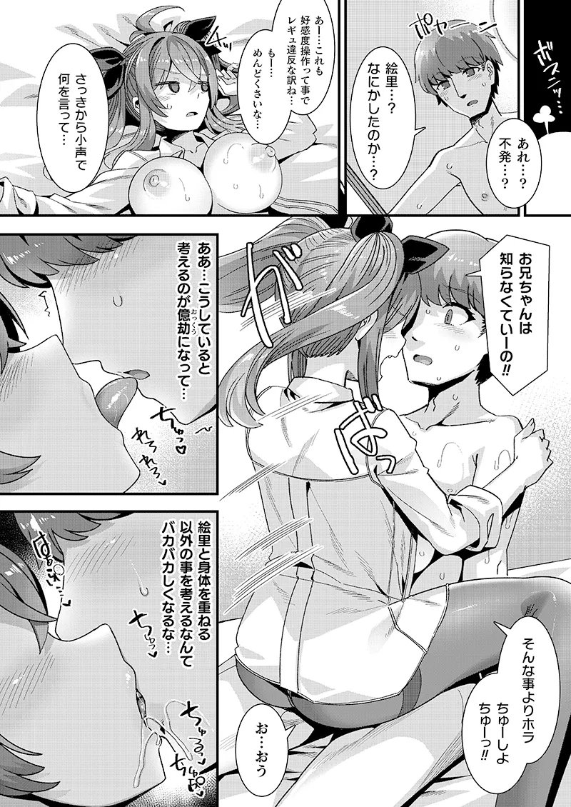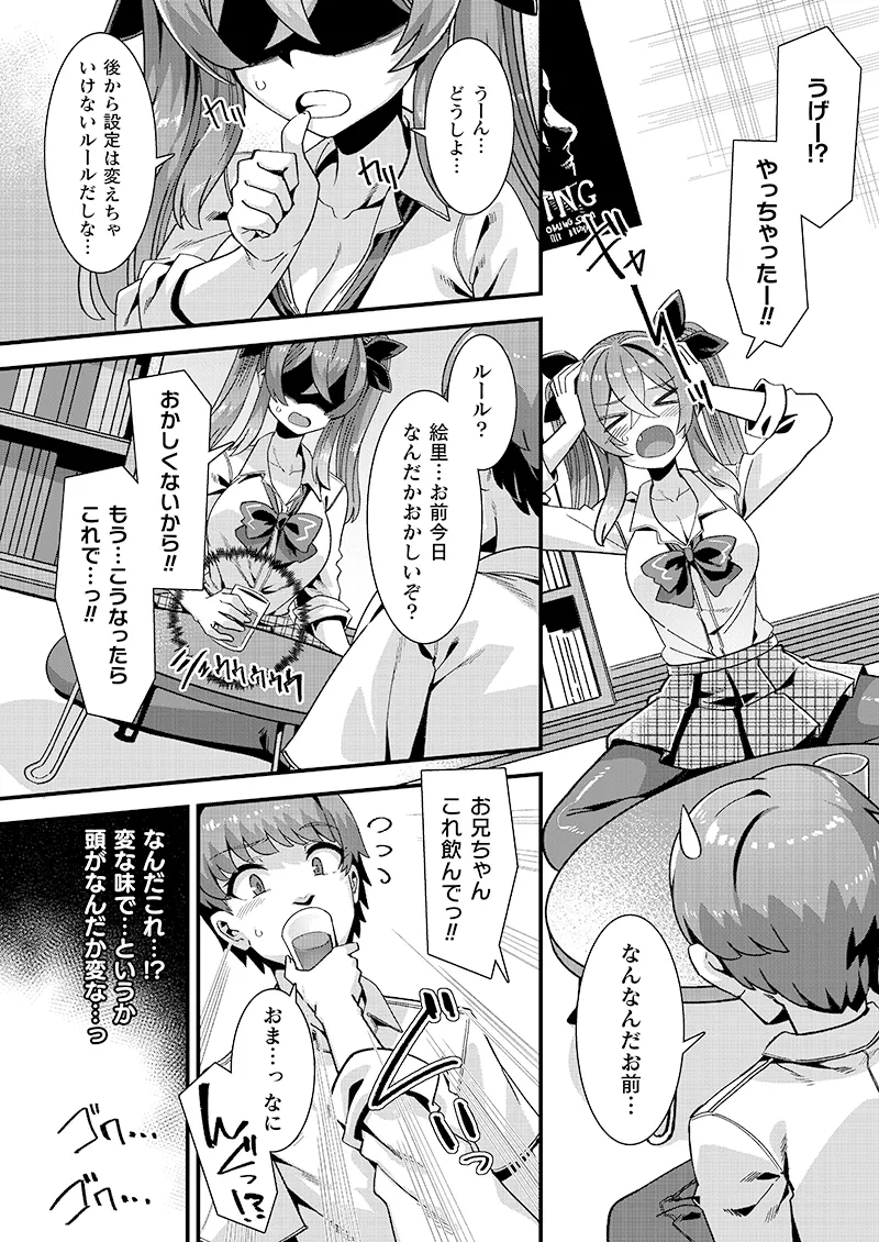 平凡な大学生アキタカ。エロい恰好をしたJDのゼミの誘惑を振り切って帰宅すると、自分のアパートの玄関前に何やら見知らぬ女が座っていた。その女はいきなり妹だと名乗り始める。自分に妹なんていない。しかし、その女に催眠術をかけられたアキタカはその女のことを絵里という妹だと認識させられてしまう。さらに、今日から一緒に住むということにされて記憶を改ざん、勝手に家に上がり込む。アキタカは疑いながらも、チンポを足でコスコスされてフル勃起。兄妹でエッチな事をしちゃいけないという常識も、その女の手によって認識を書き換えられて…。