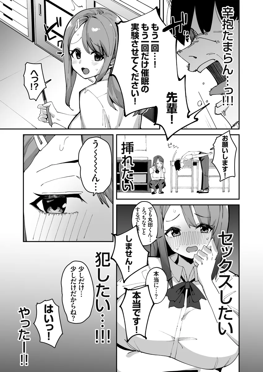 漫画研究部に所属している丸田。この部活で唯一エロ漫画を描いている。部長は、3年生の大野桃乃。ムチムチでバインバインの爆乳が今日も丸田を苦しめる。夏コミの締め切りがもう間近に迫っている中、丸田を気遣う桃乃。結局丸田は桃乃に漫画を手伝ってもらう事に。そんな時、丸田はたまたま催眠アプリを見つける。試すなら今しかない。桃乃と二人きりになった時、催眠アプリを試させてくれと直球でお願いをする。そして、桃乃は見事に催眠にかかっておっぱいを見せてしまう。夢にまでみた桃乃先輩のおっぱいを揉みしだく丸田。途中で急に催眠が解けて…。