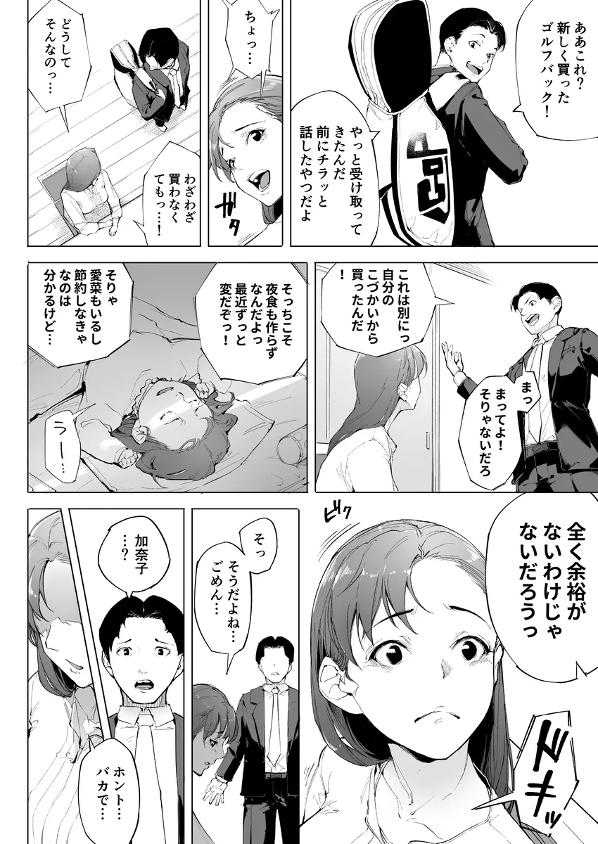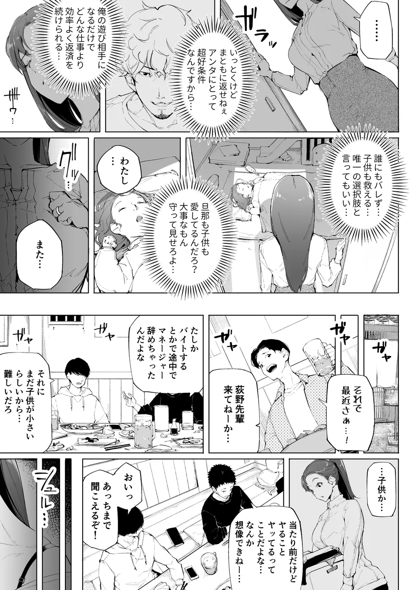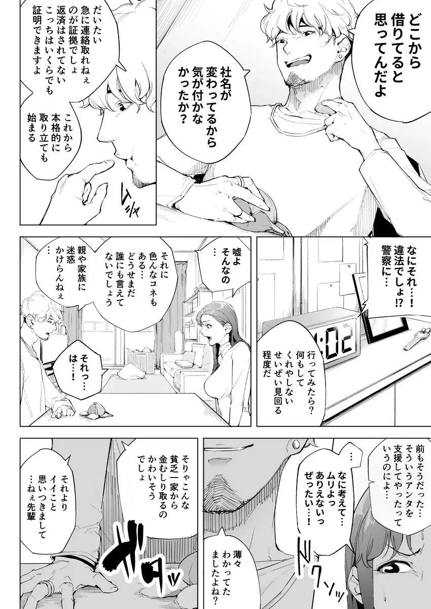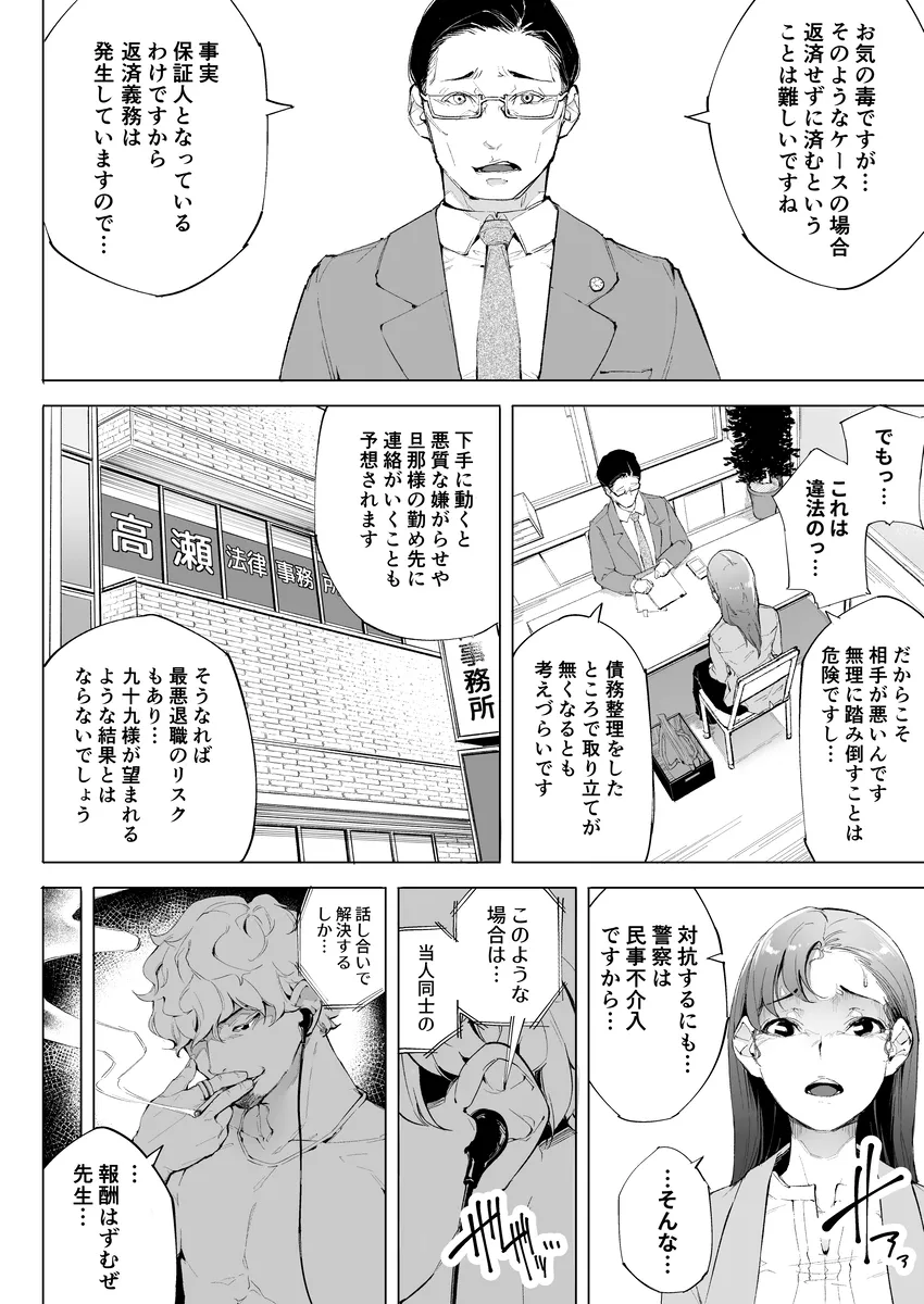高校時代に加奈子は陸上部のマネージャーをしていた。そこで出会った康介と結婚して今は愛娘の愛菜と一緒に三人で幸せな毎日を過ごしていた。しかし加奈子は失態を犯してしまう。借金の保証人になってしまったのだ。マンションの玄関には返済してくださいと張り紙が貼られていた。近所の人にこんなのを見られるわけには行かない。加奈子はすぐにそれを剥がすと目の前に闇金融屋をやっている一人の男が現れる。中西圭吾だ。圭吾は高校時代の加奈子の後輩であり、昔から良い噂は聞かない。この圭吾が今回取り立てに来たのだ。そして、加奈子は結局体を差し出すはめに…。