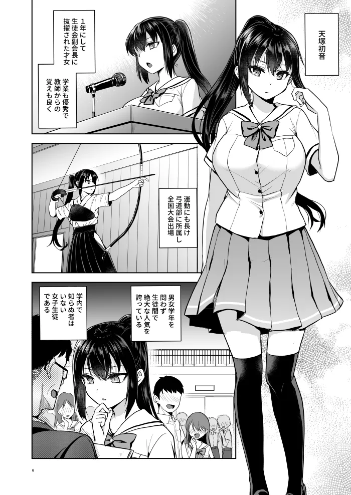 天塚初音は誰もがうらやむ優等生JK。ルックスも学校内では最上級クラスで生徒会副会長を務めている。今日も朝から初音の話題で持ちきりだ。どこからどう見ても鉄壁な彼女だが、秘密があった。化学教師の地原に毎日のように呼び出されて抱かれていたのだ。初音もなんだかんだで挿入準備は万端。むしろこの状況を逆に楽しんでいるかのよう。地原に渡された避妊薬もしっかり飲んでいるので、中出しし放題。嫌よ嫌よも好きのうち。生チンポの挿入を拒むもこれは演技。最後はたっぷり膣内射精されて快楽に浸る初音であった。