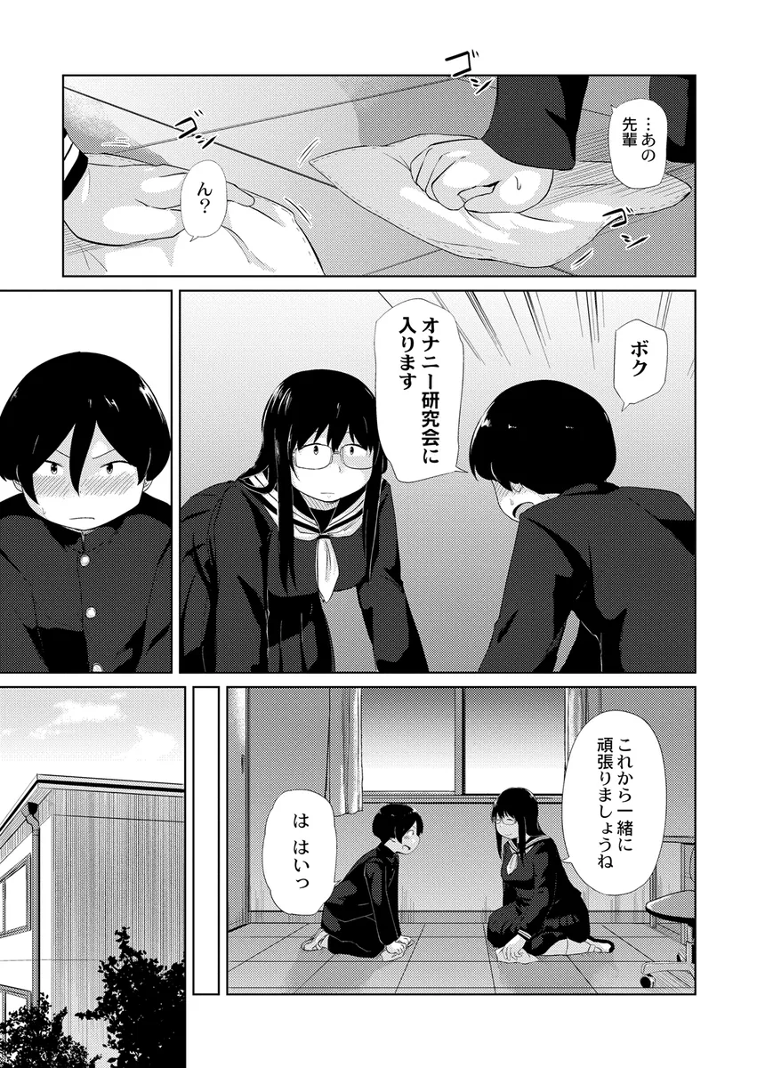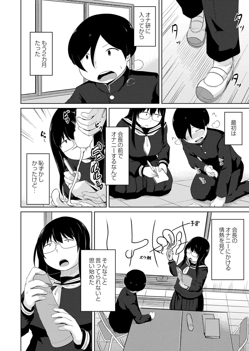 オナニー研究会に入ったコウタ。女先輩のオナニーを見てそれに魅了されてしまったのだ。先輩のオナニーにかける情熱は本物だった。最初は、先輩の前でオナニーをすることを恥ずかしいと思っていたコウタだったが、だんだんその感覚が薄れていく。今日は壁にディルドやオナホールを固定してオナニーをしてみることに。しかし、オナホやディルドが上手く固定できずに結局二人ともイケない。女先輩はここに丁度良いのがあったわと言って、なんとコウタのチンポをマンコに入れてしまう。これはオナニーではなく普通のセックスである。それに途中で気付くも…。
