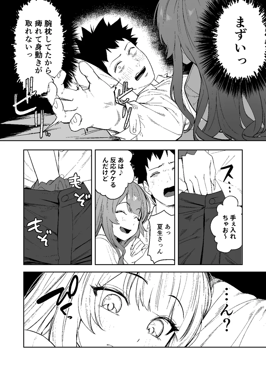 大樹は田舎から都会の大学へ進学するも貧しい実家から仕送りしてもらうわけにも行かず、こうして平日はネットカフェ、休日は運送会社でアルバイトをしている。今日のバイト終わり早く帰って寝ようと思っていたところ、新しく入ったアルバイトのJK二人組に声をかけられる。「先輩、暇?」大樹は断れず結局家にJKたちをあげてしまう。ゲームをしたりして遊びつくした後、いざベッドへ。大樹は全く下心など無かったが、二人から迫られて添い寝することに。もちろんチンポはどうしても反応してしまう。そしてそれがバレて手コキでチンポをシゴかれ…。