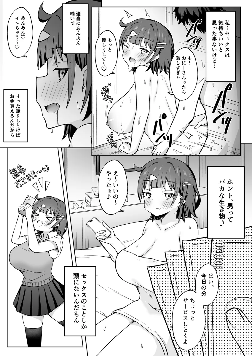 ソシャゲに課金しまくって金欠なJKルナ。エッチなんて気持ちいいと思ったことは一度もない。ルナはソシャゲに課金するためにパパ活を始める。テキトーにあんあん言ってイったふりをすれば簡単にお金を稼げる。男なんてチョロい。そう思っていた。この日の新しいパパ活相手はおじさんだった。おじさんのチンポを早速しゃぶろうとするルナだったが、おじさんは攻めたいタイプらしい。パパ活相手としては面倒くさいタイプだ。ルナは手マンでおまんこを刺激されると、ぷしゃっと潮を吹いてイってしまう。ルナはそこで初めてセックスの気持ちよさを知り…。