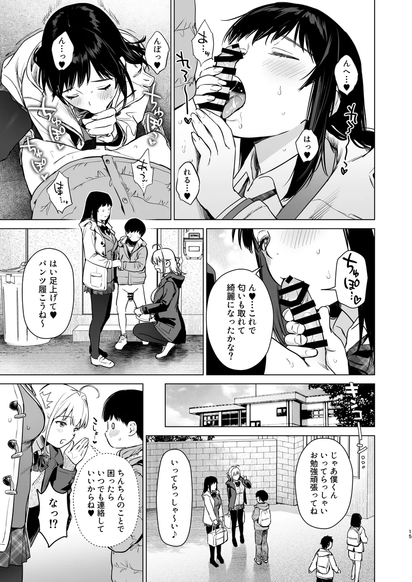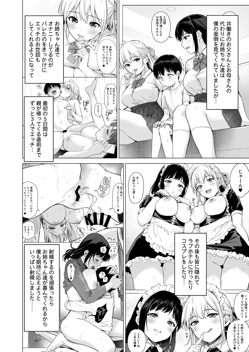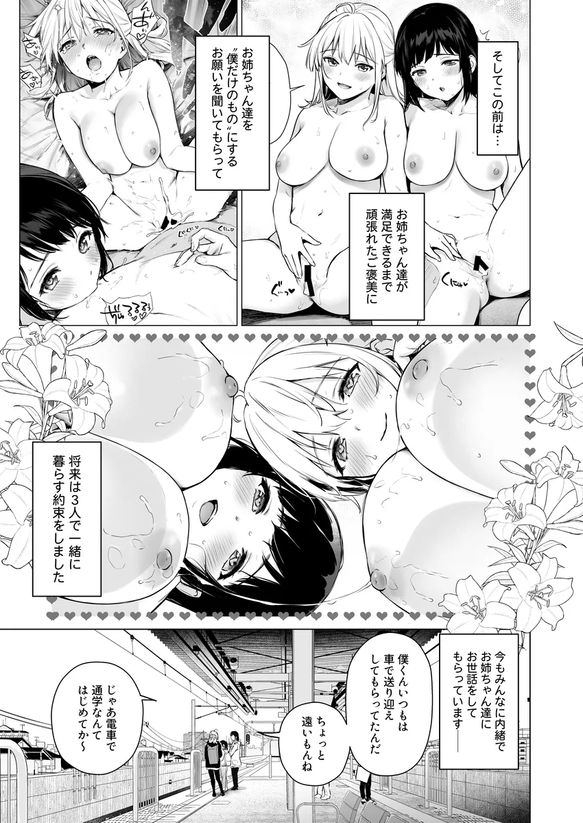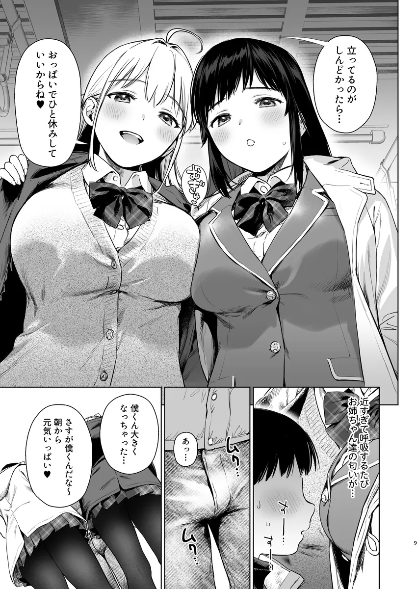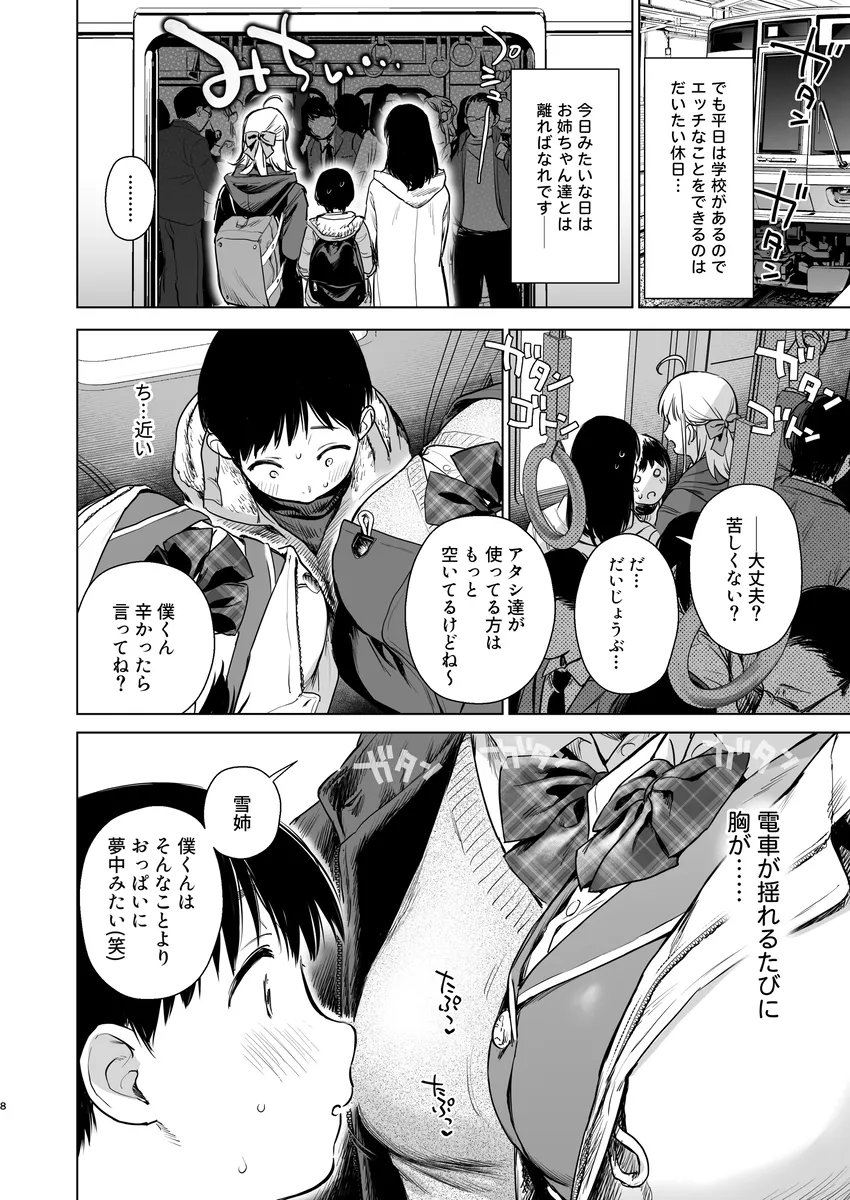 僕くんは雪お姉ちゃんと陽菜お姉ちゃんにいつも朝迎えに来てもらう。二人は僕くんの従姉妹だ。お姉ちゃん達にオナニーバレしたのがきっかけでエッチのお世話もしてくれるようになった。ラブホテルに行ったりコスプレをしたり、射精するのを頑張ったらいっぱい褒めてくれるお姉ちゃんたち。将来は三人で暮らすことをこの前約束した。平日は学校があるのでエッチな事をできるのはだいたい休日。この日、満員電車で三人で乗り込む。ぎゅうぎゅう詰め状態で二人のおっぱいが顔に当たる。するとみるみるうちにちんちんが勃起して…。