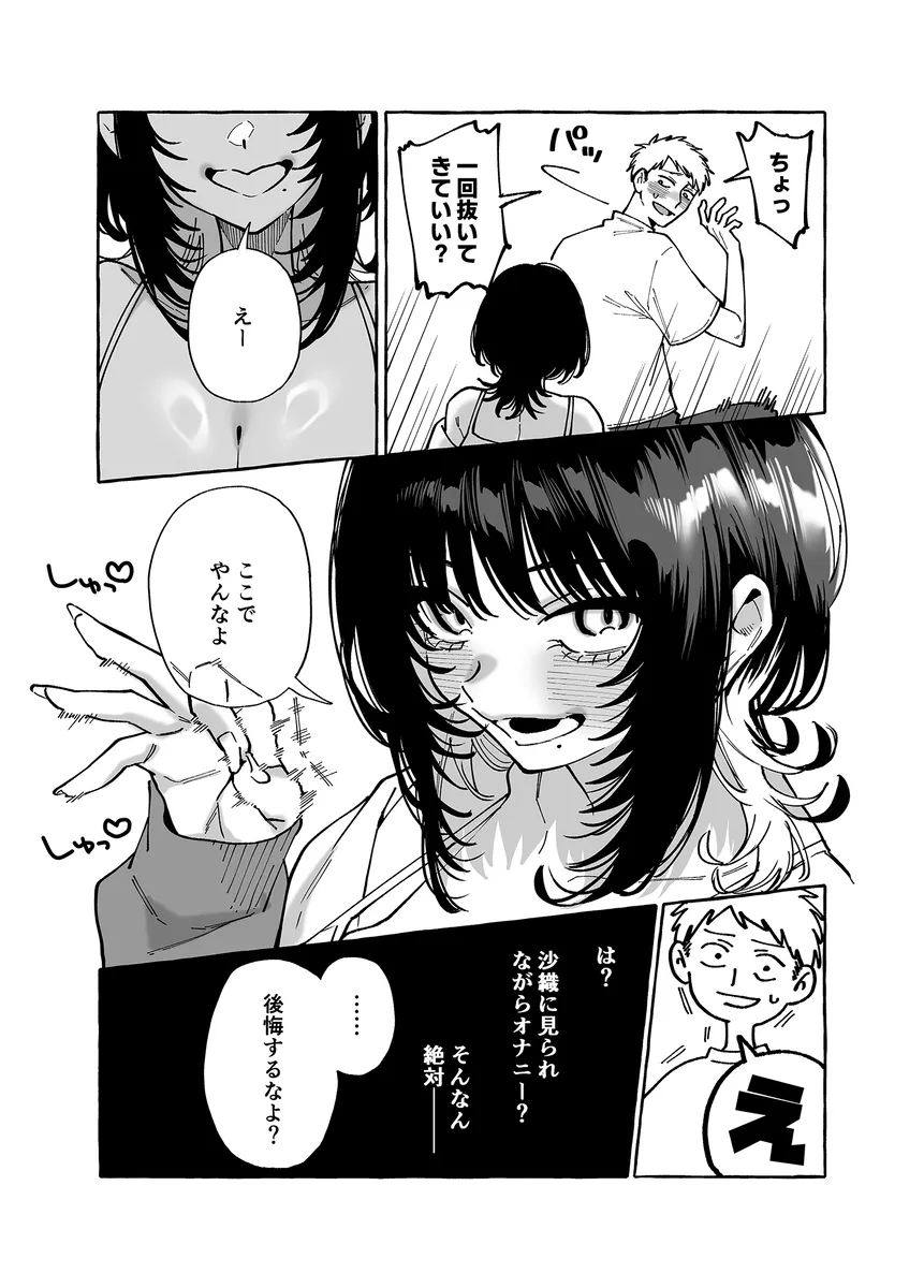 沙織とは小さいころからの腐れ縁、所謂幼馴染と言うやつだ。雅道はこの前買ったゲームを持って沙織の家にやって来る。しかしいつの間にか立派な女の体に成長した沙織に雅道は勃起してしまう。勃起を気付かれた雅道。最近抜いてないからと言い訳をしたところここで抜いてとお願いされる。雅道はその場でチンポをシコり始めると沙織はおっぱいを見せてオカズを提供。そして、沙織は雅道のチンポに手を伸ばしてシコシコのお手伝い。すると雅道はドバドバとザーメンを発射。沙織の手は雅道のザーメンでドロドロに…。