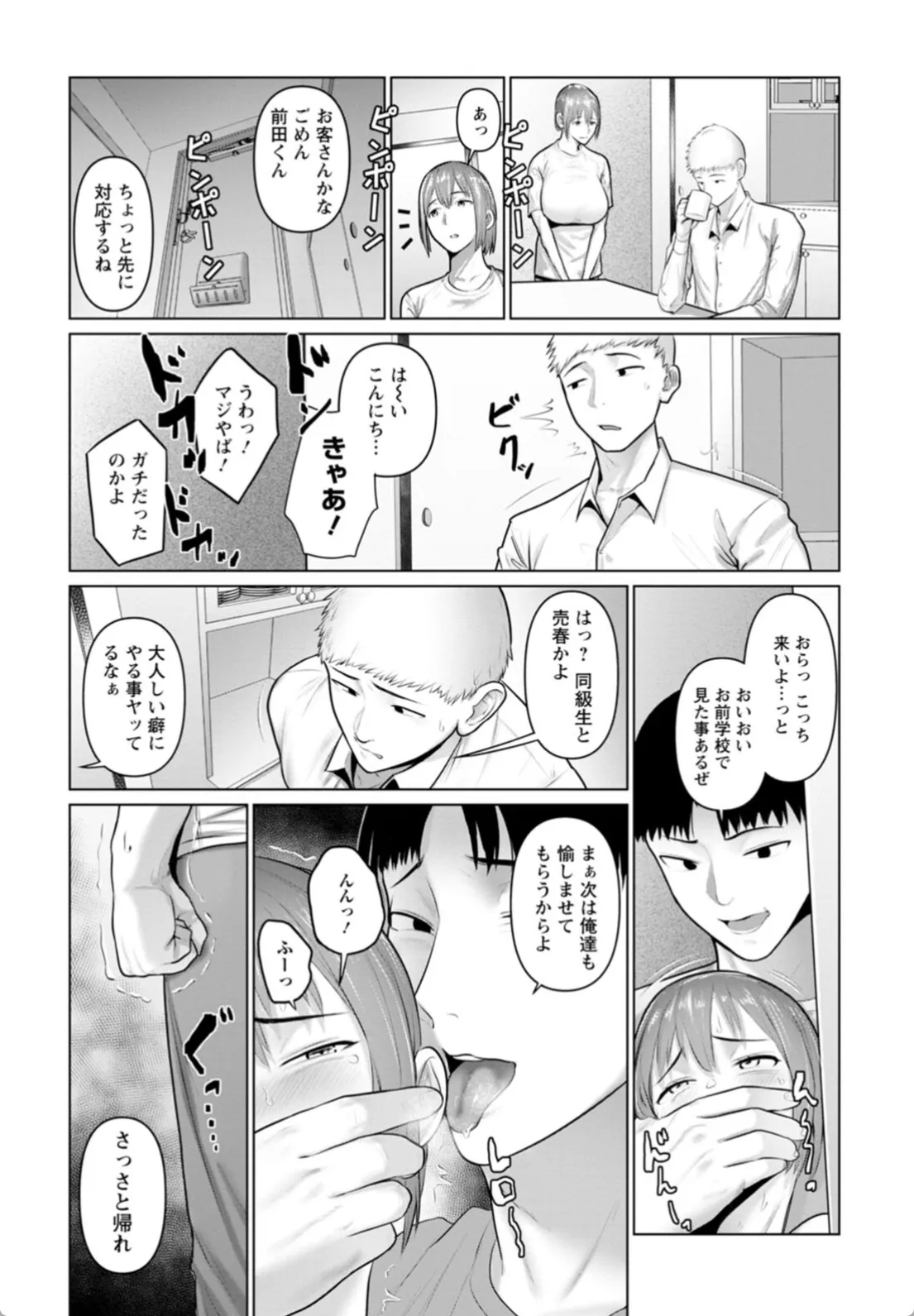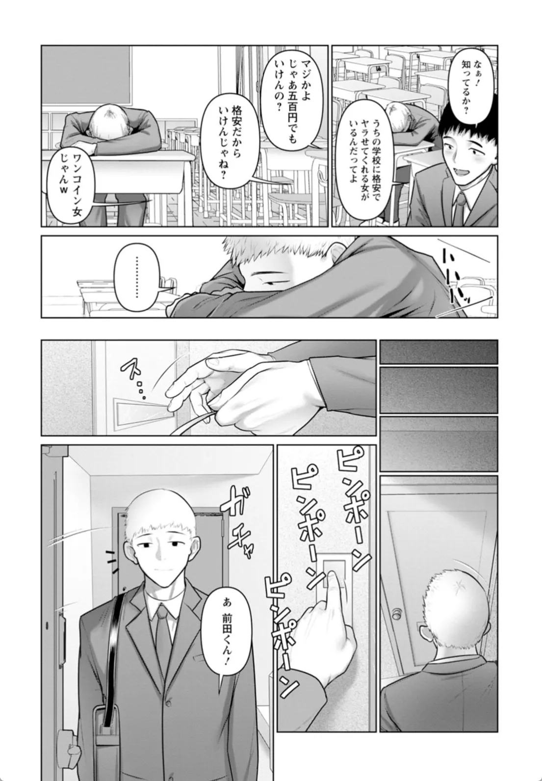 学校内にワンコインでヤらしてくれる女がいるらしい。風の噂だがそんな女が本当にいるのだろうか。いた―。その女の名前は隣のクラスの藤田だ。藤田は男を家に呼び込んでカーテンを閉める。待たせてごめんね、いいよ?藤田はたぷんたぷんに成長した巨乳を露出させる。やって来たのは前田だ。安心する匂いがすると前田によりかかる藤田。本能に従ってチンポでマンコを突きまくる。一発ヤり終わって休んでいるとそこに男たちが乗り込んでくる。この男たちもどうやら藤田の体目当てだったらしく…。