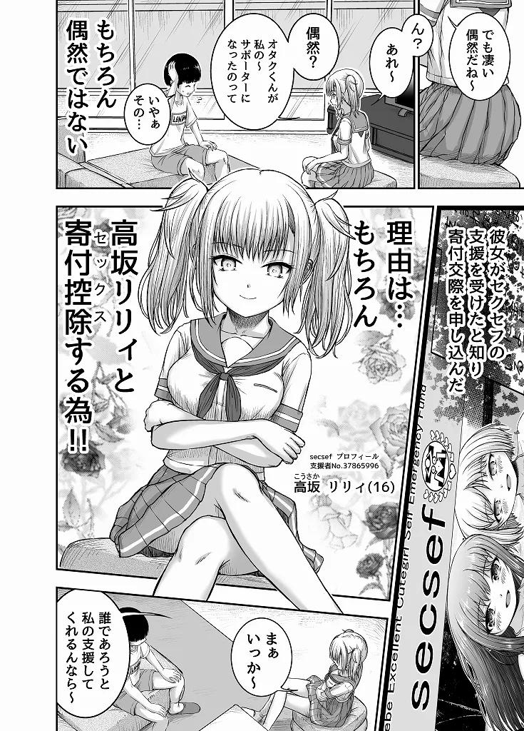 恵まれない女の子を支援する機関セクセフ。寄付をすると女の子が寄付控除という名のセックスをしてくれる。そこに同じクラスだったことのある初恋の相手高坂が登録していることをしる奥田。奥田は高坂と同い年。すぐに寄付を申し込み早速一回目の寄付控除を行うことに。高坂はカースト上位のJKで奥田のことなどアウトオブ眼中だった。しかし寄付をしてくれるならとすぐに奥田のチンポをフェラ抜き。口の中にドバドバ射精する奥田。聞いたところによると高坂は処女だった。奥田ももちろん童貞だ。そしてお互い初セックスへ。