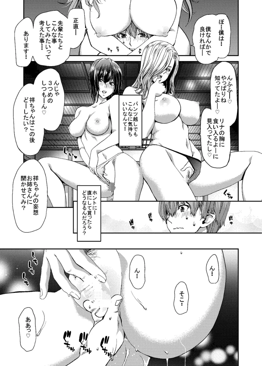 ワニ島製作所課長のリナと部長のあやめ。翔太郎は職場でミスをしてしまい今日もこの二人にミスをカバーしてもらう。いつもこんなにカッコイイ先輩たちの部下になれて僕は幸せですと言った瞬間に二人のえちえちスイッチが入ってしまう。高級旅館で三人で食事をしている最中の事だった。そして、翔太郎は二人にチンポを愛撫されて亀頭をガッチガチに勃起させる。あやめのマンコを手マンで刺激しながらリナの巨乳でパイズリされた翔太郎はあっけなくザーメンを噴射してしまう。セックスは翌日も続き―。